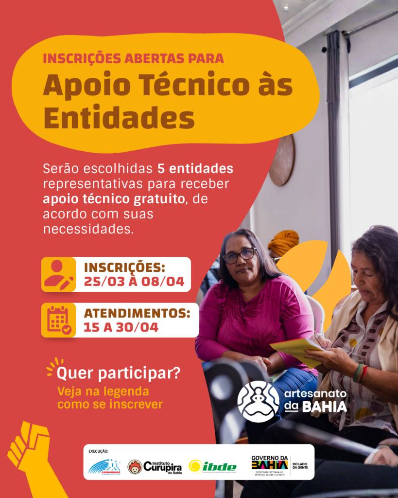 _Cinco grupos ou entidades representativas serão escolhidos para apoio técnico em gestão e comercialização_ O Programa de Qualificação do Artesanato da Bahia abriu, nesta quarta-feira (25), as inscrições para seleção de cinco entidades representativas ou grupos de produção artesanal. O prazo vai até 8 de abril, exclusivamente pelo formulário online: https://forms.gle/rE3qFrXBbam8MnfR9. A iniciativa visa fortalecer …